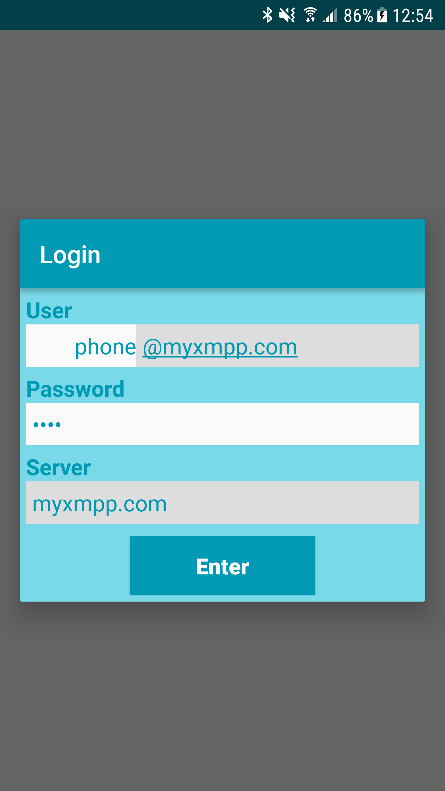 Right after you start Mangosta-Android for the first time, you will need to login to your XMPP server. In order to do that, just enter the JID you have created for the phone (phone@myxmpp.com), the password (xmpp_password) and the server address (2.2.2.2 or myxmpp.com if you've set up the domain to actually point to this IP address), and then confirm by clicking "Enter".