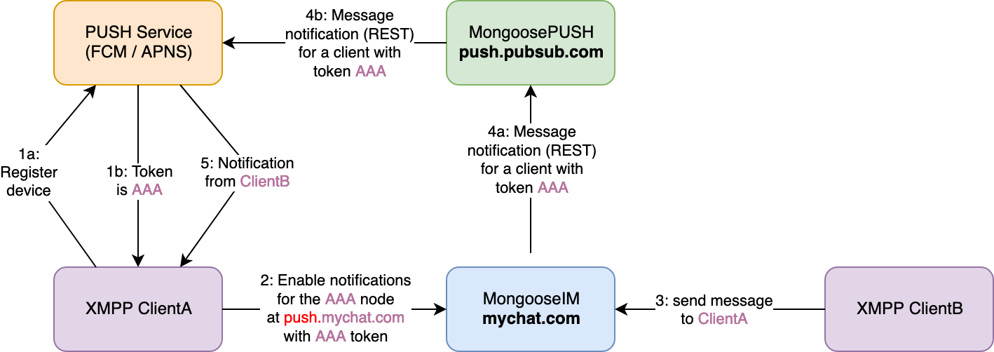 One picture is worth a thousand words, so here are two diagrams showing the typical communication when using push notifications: